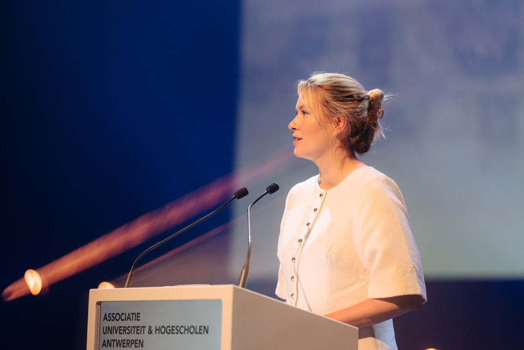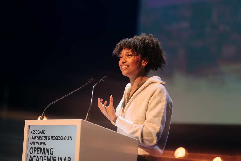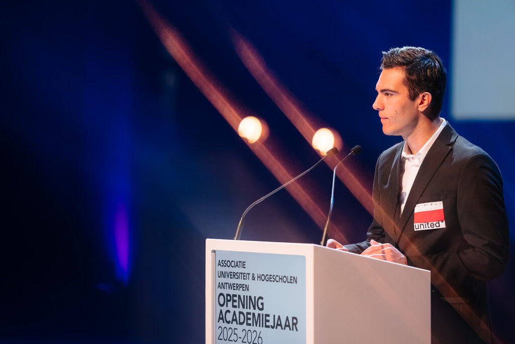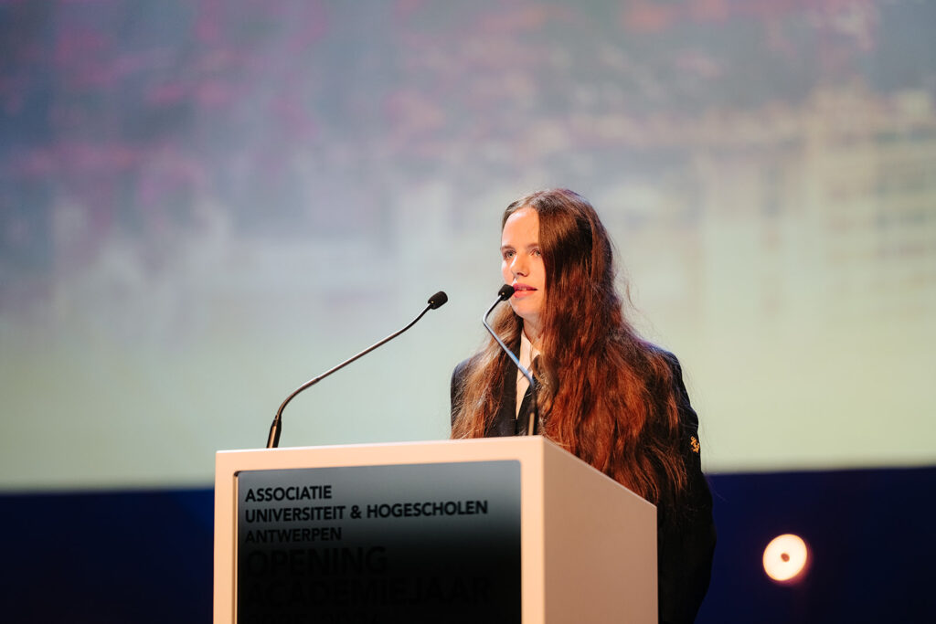 Ook de twee speechende studenten hadden het over verbinding. “Het begin van een opleiding is vaak onwennig, maar gezamenlijke ervaringen creëren sterke en blijvende banden. Samenwerken blijft daarbij een noodzaak,” aldus Gebbe Bogaert (AMA). Kane De Bruyne (KdG) noemde diversiteit een superkracht: “Onze interesses en dromen brengen ons samen en door al de verschillen maken we er iets ongelofelijks mooi van. Ik sta altijd versteld hoeveel ik kan leren van iemand die anders dan ik naar de wereld kijkt.” Lees hier de toespraak van Gebbe en hier de toespraak van Kane.