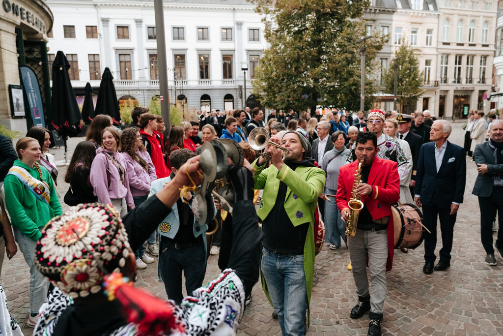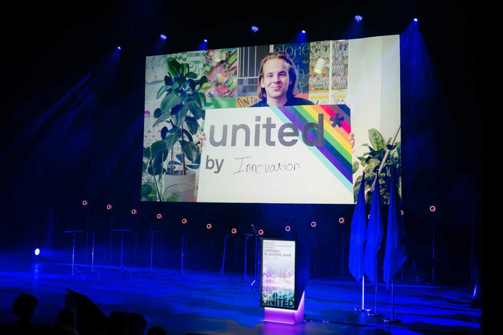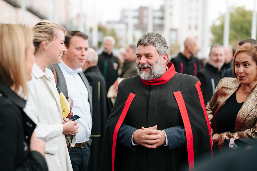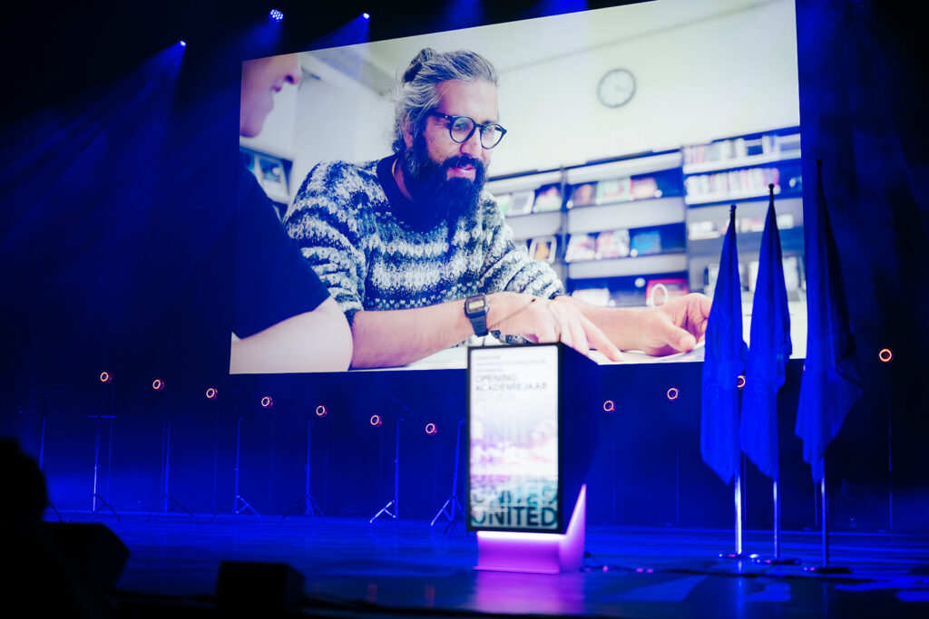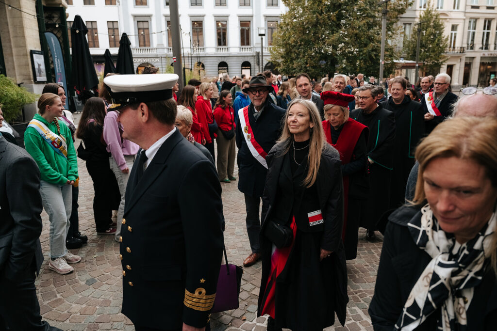 Ook de twee speechende studenten hadden het over verbinding. “Het begin van een opleiding is vaak onwennig, maar gezamenlijke ervaringen creëren sterke en blijvende banden. Samenwerken blijft daarbij een noodzaak,” aldus Gebbe Bogaert (AMA). Kane De Bruyne (KdG) noemde diversiteit een superkracht: “Onze interesses en dromen brengen ons samen en door al de verschillen maken we er iets ongelofelijks mooi van. Ik sta altijd versteld hoeveel ik kan leren van iemand die anders dan ik naar de wereld kijkt.” Lees hier de toespraak van Gebbe en hier de toespraak van Kane.