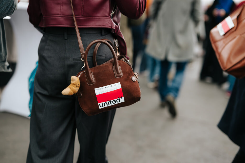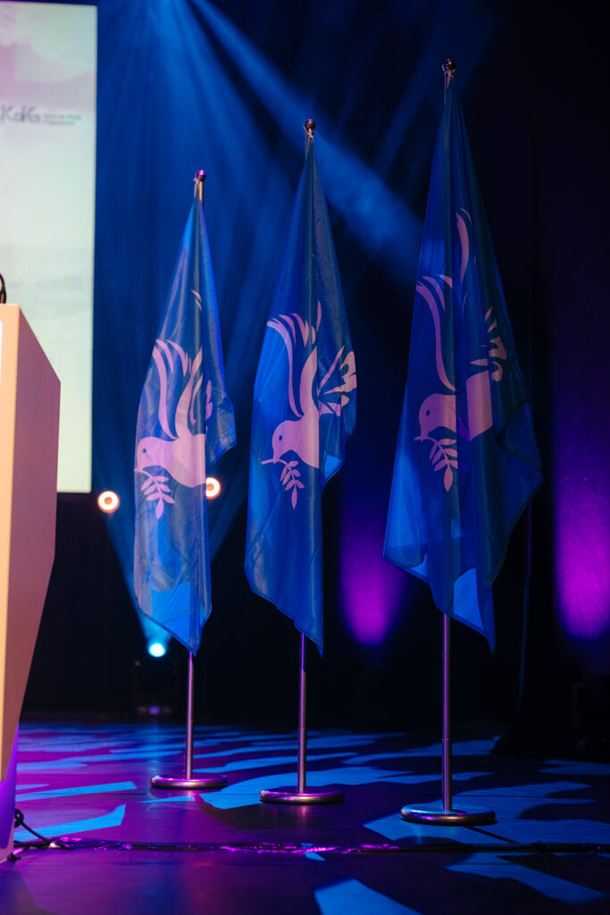 Wie dat wilde, kon een sticker met het United*-logo en met een rode lijn opkleven. Zo kregen deelnemers de kans om uiting te geven aan hun verontwaardiging en machteloosheid rond de schending van mensenrechten overal ter wereld. De drie vredesvlaggen op het podium gaven een krachtig signaal: wij staan voor vrede en rechtvaardigheid. De zitting opende met Raise my voice van Jasper Steverlinck. Het is immers belangrijk dat we niet zwijgen en onrecht aankaarten.