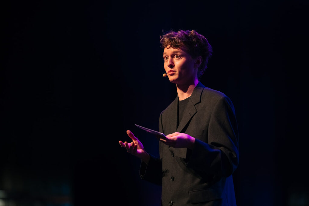 De presentatie was in handen van Xander Kindt, masterstudent Drama, afstudeerrichting Woordkunst (KCA).