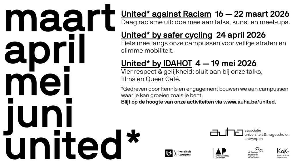 Van 16 tot 22 maart 2026 bundelen Universiteit Antwerpen, KdG Hogeschool, AP Hogeschool en de Antwerp Maritime Academy (AMA) opnieuw de krachten tijdens de Week voor antiracisme en antidiscriminatie. Elke partnerinstelling organiseert eigen activiteiten, toegankelijk voor alle studenten en medewerkers van de AUHA-instellingen. Deze week wordt georganiseerd in het kader van de Internationale Dag tegen Racisme en Discriminatie op zaterdag 21 maart.
