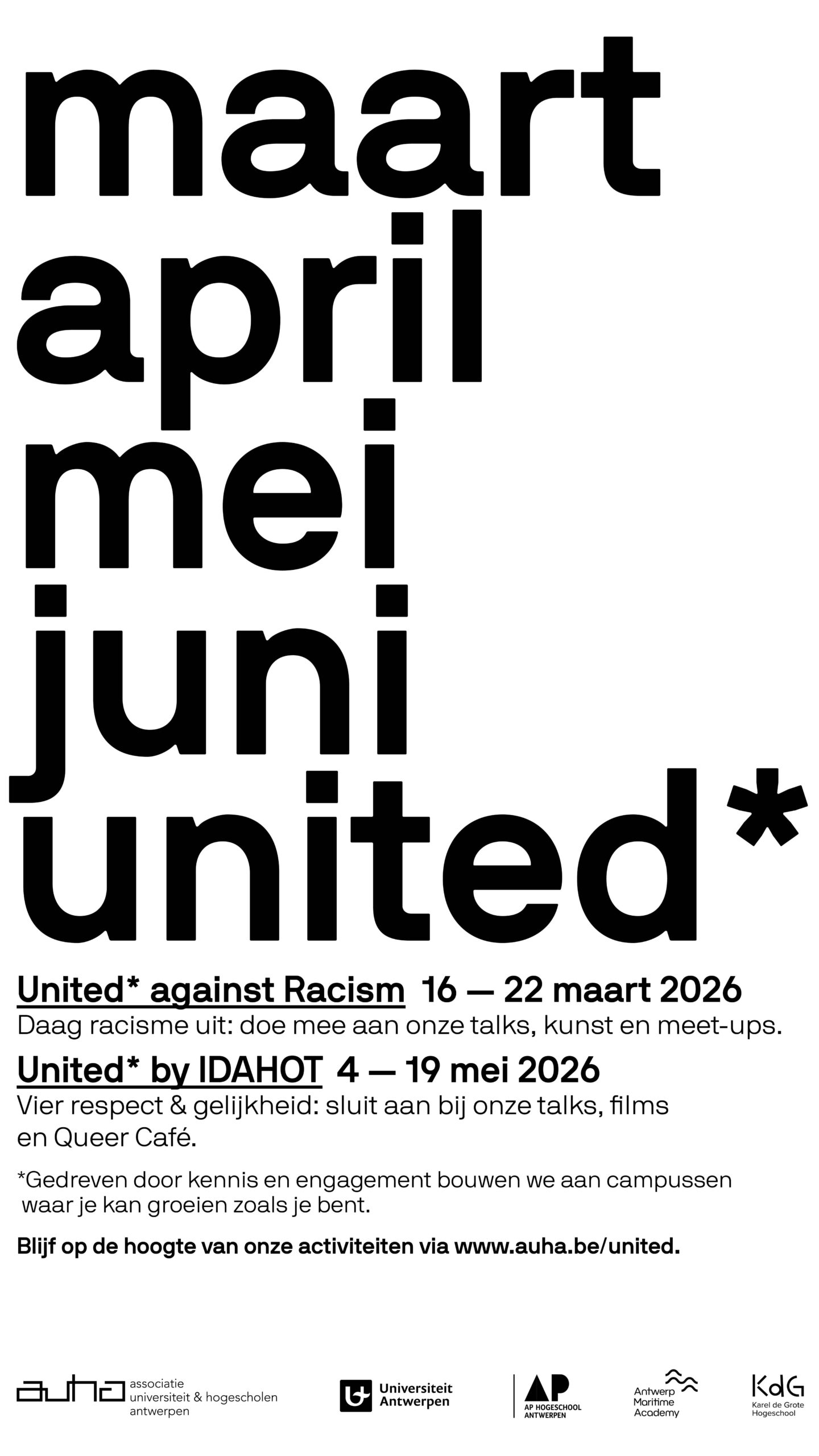 Van 16 tot 22 maart 2026 bundelen Universiteit Antwerpen, KdG Hogeschool, AP Hogeschool en de Antwerp Maritime Academy (AMA) opnieuw de krachten tijdens de Week voor antiracisme en antidiscriminatie. Elke partnerinstelling organiseert eigen activiteiten, toegankelijk voor alle studenten en medewerkers van de AUHA-instellingen. Deze week wordt georganiseerd in het kader van de Internationale Dag tegen Racisme en Discriminatie op zaterdag 21 maart.